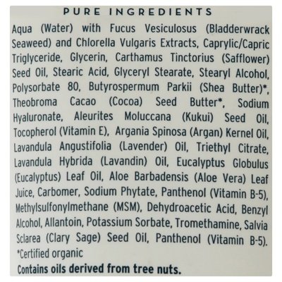INGREDIENTS: Pure Ingredients: Aqua (Water) with Fucus Vesiculosus (Bladderwrack Seaweed) and Chlorella Vulgaris Extracts, Caprylic/Capric Triglyceride, Glycerin, Carthamus Tinctorius (Safflower) Seed Oil, Stearic Acid, Glyceryl Stearate, Stearyl Alcohol, Polysorbate 80, Butyrospermum Parkii (Shea Butter) (Cetified Organic), Theobroma Cacao (Cocoa) Seed Butter (Cetified Organic), Sodium Hyaluronate, Aleurites Moluccana (Kukui) Seed Oil, Tocopherol (Vitamin E), Argania Spinosa (Argon) Kernel Oil, Lavandula Angustifolia (Lavender) Oil, Triethyl Citrate, Lavandula Hybrida (Lavandin) Oil, Eucalyptus Globulus (Eucalyptus) Leaf Oil, Aloe Barbadensis (Aloe Vera) Leaf Juice, Carbomer, Sodium Phytate, Panthenol (Vitamin B-5), Methylsulfonylmethane (MSM), Dehydroacetic Acid, Benzyl Alcohol, Allantoin, Potassium Sorbate, Tromethamine, Salvia Sclarea (Clary Sage) Seed Oil, Panthenol (Vitamin B-5).
