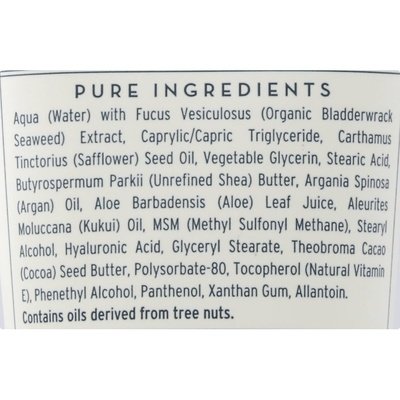 INGREDIENTS: Pure Ingredients: Aqua (Water) with Fucus Vesiculosus (Organic Bladderwrack Seaweed) Extract, Caprylic/Capric Triglyceride, Carthamus Tinctorius (Safflower) Seed Oil, Vegetable Glycerin, Stearic Acid, Butyrospermum Parkii (Unrefined Shea) Butter, Argania Spinosa (Argan) Oil, Aloe Barbadensis (Aloe) Leaf Juice, Aleurites Moluccana (Kukui) Oil, MSM (Methyl Sulfonyl Methane), Stearyl Alcohol, Hyaluronic Acid, Glyceryl Stearate, Theobroma Cacao (Cocoa) Seed Butter, Polysorbate-80, Tocopherol (Natural Vitamin E), Phenethyl Alcohol, Panthenol, Xanthan Gum, Allantoin.