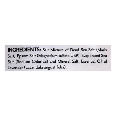INGREDIENTS: Salt Mixture of Dead Sea Salt (Maris Sal), Epsom Salt (Magnesium Sulfate USP), Evaporated Sea Salt (Sodium Chloride) and Mineral Salt, Essential Oil of Lavender (Lavandula Angustifolia).