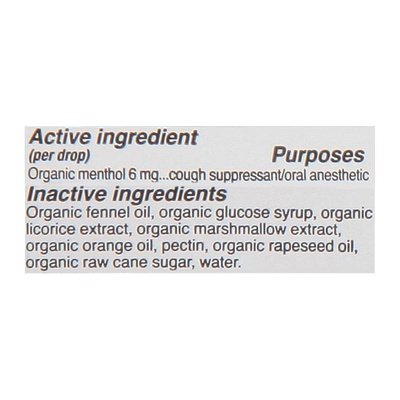 DESCRIPTION: USDA Organic. Certified Organic by CCOF and Ecocert IMOswiss. New! Herbalist formulated. Soothes sore throats & relieves coughs. Cough suppressant. Oral anesthetic. Natural cough suppressant. All the support of Throat Coat tea is now available in a convenient, on-the-go lozenge. This unique formula blends soothing organic menthol with traditional, organic herbal extracts such as licorice and marshmallow roots making this product both delicious and efficacious. For an occasional sore throat or cough, this little lozenges is bound to give you relief whenever you need it. Questions? Call 1-800-543-4372, 9 am - 5 pm PST M-F. Certified B Corporation. Also Available in: Throat Coat: Lemon Ginger Echinacea. Throat Coat: Eucalyptus Mint. Product of Switzerland. < Per Drop: Active < Organic Menthol (6 mg), Cough Suppressant/Oral Anesthetic. Inactive < Organic Fennel Oil, Organic Glucose Syrup, Organic Licorice Extract, Organic Marshmallow Extract, Organic Orange Oil, Pectin, Organic Rapeseed Oil, Organic Raw Cane Sugar, Water.
