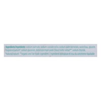 INGREDIENTS: Sodium Palmate, Sodium Cocoate or Sodium Palm Kernelate, Water/Eau, Glycerin, Fragrance/Parfum (Natural), Sodium Gluconate, Butyrospermum Parkii (Shea) Butter Extract (Organic and Fair Trade Ingredient), Sodium Chloride.