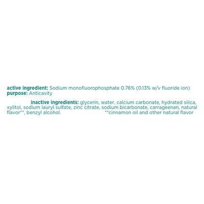 INGREDIENTS: Active Ingredients: Sodium Monofluorophosphate (0.13% w/v Flouride Ion) (0.76 %), Anticavity. Inactive Ingredients: Glycerin, Water, Calcium Carbonate, Hydrated Silica, Xylitol, Sodium Lauryl Sulfate, Zinc Citrate, Sodium Bicarbonate, Carrageenan, Natural Flavor (Cinnamon Oil and Other Natural Flavor), Benzyl Alcohol.