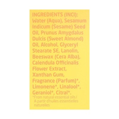 INGREDIENTS: Water (Aqua), Sesamum Indicum (Sesame) Seed Oil, Prunus Amygdalus Dulcis (Sweet Almond Oil, Alcohol, Glyceryl Stearate SE, Lanolin, Beeswax (Cera Alba), Calendula Officinalis Flower Extract, Xanthan Gum, Fragrance (Parfum) (from Natural Essential Oils), Limonene (from Natural Essential Oils), Linalool (from Natural Essential Oils), Geranoil (from Natural Essential Oils), Citral (from Natural Essential Oils).
