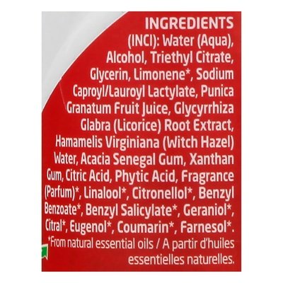 INGREDIENTS: Water (Aqua), Alcohol, Triethyl Citrate, Glycerin, Limonene (from Natural Essential Oils), Sodium Caproyl/Lauroyl Lactylate, Punica Granatum Fruit Juice, Glycyrrhiza Glabra (Licorice) Root Extract, Hamamelis Virginiana (Witch Hazel) Water, Acacia Senegal Gum, Xanthan Gum, Citric Acid, Phytic Acid, Fragrance (Parfum) (from Natural Essential Oils), Linalool (from Natural Essential Oils), Citronellol (from Natural Essential Oils), Benzyl Salicylate (from Natural Essential Oils), Geraniol (from Natural Essential Oils), Citral (from Natural Essential Oils), Eugenol (from Natural Essential Oils), Coumarin (from Natural Essential Oils) Farnesol (from Natural Essential Oils).