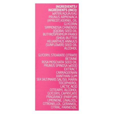INGREDIENTS: Water/Aqua/Eau, Prunus Armeniaca (Apricot) Kernel Oil, Glycerin, Simmondsia Chinensis (Jojoba) Seed Oil, Butyrospermum Parkii (Shea) Butter, Helianthus Annuus (Sunflower) Seed Oil, Alcohol, Glyceryl Ste arate Citrate, Betaine, Rosa Moschata Seed Oil, Prunus Spinosa Wood Extract, Carrageenan, Xanthan Gum, Sea Salt, Tocopherol, Lactic Acid, Cetearyl Alcohol, Glyceryl Caprylate, Fragrance (Parfum), Limonene, Linalool, Citronellol, Geraniol, Citral, Farnesol.