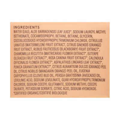 INGREDIENTS: Water (Eau), Aloe Barbadensis Leaf Juice (Certified Organic), Sodium Lauroyl Methyl Isethionate, Cocamidopropyl Betaine, Betaine, Glycerin, Cocoglucosides Hydroxypropyltrimonium Chloride, Citrullus Lanatus (Watermelon) Fruit Extract, Citrus Sinensis (Orange) Fruit Extract, Rubus Fruticosus (Blackberry) Fruit Extract (Certified Organic), Chamomilla Recutita (Matricaria) Flower Extract (Certified Organic), Euterpe Oleracea Fruit Extract (Certified Organic), Rosa Canina Fruit Extract (Certified Organic), Calendula Officinalis Flower Extract (Certified Organic), Aspalathus Linearis Leaf Extract (Certified Organic), Punica Granatum Extract (Certified Organic), Citrus Aurantium Dulcis (Orange) Peel Oil, Citrus Nobilis (Mandarin Orange) Peel Oil, Eugenia Caryophyllus (Clove) Bud Oil, Persea Gratissima (Avocado) Oil, Levulinic Acid, Sodium Levulinate, Guar Hydroxypropyltrimonium Chloride, Sodium Cocoyl Glutamate, Sodium Methyl Cocoyl Taurate, Potassium Sorbate, Citric Acid, Sodium Hydroxide.