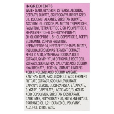 INGREDIENTS: Water (Eau), Glycerin, Cetearyl Alcohol, Cetearyl Olivate, Sclerocarya Birrea Seed Oil, Coconut Alkanes, Sorbitan Olivate, Ascorbyl Glucoside, Palmitoyl Tripeptide-1, Palmitoyl Tetrapeptide-7, Sh-Polypeptide-1, Sh-Polypeptide-9, Sh-Polypeptide-11, Sh-Oligopeptide-1, Sh-Oligopeptide-2, Acetyl Glutamine, Copper Palmitoyl Heptapeptide-14, Heptapeptide-15 Palmitate, Pseudoalteromonas Ferment Extract, Ferulic Acid, Nymphaea Odorata Root Extract, Symphytum Officinale Root Cell Extract, Sodium PCA, Salicylic Acid, Sodium Hyaluronate, Lecithin, Isomalt, Linoleic Acid, Linolenic Acid, Sodium Anisate, Xanthan Gum, Bacillus/Folic Acid Ferment Filtrate Extract, Sodium Levulinate, Caprylyl Glycol, Coco-Caprylate/Caprate, Glyceryl Caprylate, Lactic Acid/Glycolic Acid Copolymer, Sorbitan Isostearate, Carbomer, Polysorbate 20, Butylene Glycol, Propanediol, 1.2-Hexanediol, Polyvinyl Alcohol, Citric Acid.