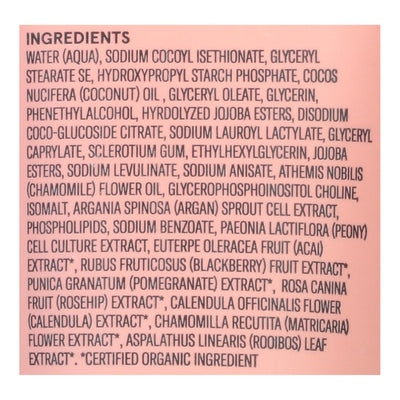 INGREDIENTS: Water (Aqua), Sodium Cocoyl Isethionate, Glyceryl Stearate SE, Hydroxypropyl Starch Phosphate, Cocos Nucifera (Coconut) Oil, Glyceryl Oleate, Glycerin, Phenethylalcohol, Hyrdolyzed Jojoba Esters, Disodium Coco-Glucoside Citrate, Sodium Lauroyl Lactylate, Glyceryl Caprylate, Sclerotium Gum, Ethylhexylglycerin, Jojoba Esters, Sodium Levulinate, Sodium Anisate, Athemis Nobilis (Chamomile) Flower Oil, Glycerophosphoinositol Choline, Isomalt, Argania Spinosa (Argan) Sprout Cell Extract, Phospholipids, Sodium Benzoate, Paeonia Lactiflora (Peony) Cell Culture Extract, Euterpe Oleracea Fruit (Acai) Extract (Certified Organic Ingredient), Rubus Fruticosus (Blackberry) Fruit Extract (Certified Organic Ingredient), Punica Granatum (Pomegranate) Extract (Certified Organic Ingredient), Rosa Canina Fruit (Rosehip) Extract (Certified Organic Ingredient), Calendula Officinalis Flower (Calendula) Extract (Certified Organic Ingredient), Chamomilla Recutita (Matricaria) Flower Extract (Certified Organic Ingredient), Aspalathus Linearis (Rooibos) Leaf Extract(Certified Organic Ingredient).