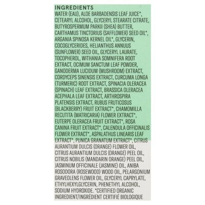 INGREDIENTS: Water (Eau), Aloe Barbadensis Leaf Juice (Certified Organic Ingredient), Cetearyl Alcohol, Glyceryl Stearate Citrate, Butyrospermum Parkii (Shea) Butter, Carthamus Tinctorius (Safflower) Seed Oil (Certified Organic Ingredient), Argania Spinosa Kernel Oil (Certified Organic Ingredient), Glycerin, Cocoglycerides, Helianthus Annuus (Sunflower) Seed Oil, Glyceryl Laurate, Tocopherol, Withania Somnifera Root Extract, Ocimum Sanctum Leaf Powder, Ganoderma Lucidum (Mushroom) Extract, Cordyceps Sinensis Extract, Curcuma Longa (Turmeric) Root Extract, Spinacia Oleracea (Spinach) Leaf Extract, Brassica Oleracea Acephala Leaf Extract, Arthrospira Platensis Extract, Rubus Fruticosus (Blackberry) Fruit Extract (Certified Organic Ingredient), Chamomilla Recutita (Matricaria) Flower Extract (Certified Organic Ingredient), Euterpe Oleracea Fruit Extract (Certified Organic Ingredient), Rosa Canina Fruit Extract (Certified Organic Ingredient), Calendula Officinalis Flower Extract (Certified Organic Ingredient), Aspalathus Linearis Leaf Extract (Certified Organic Ingredient), Punica Granatum Extract (Certified Organic Ingredient), Citrus Aurantium Dulcis (Orange) Flower Oil, Citrus Aurantium Dulcis (Orange) Peel Oil, Citrus Nobilis (Mandarin Orange) Peel Oil, Jasminum Officinale (Jasmine) Oil, Aniba Rosodora (Rosewood) Wood Oil, Pelargonium Graveolens Flower Oil, Glyceryl Caprylate, Ethylhexylglycerin, Phenethyl Alcohol, Sodium Hydroxide.