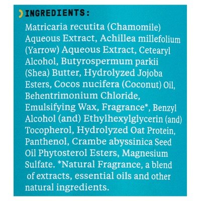 INGREDIENTS: Matricaria Recutita (Chamomile) Aqueous Extract, Achillea Millefolium (Yarrow) Aqueous Extract, Cetearyl Alcohol, Butyrospermum Parkii (Shea) Butter, Hydrolyzed Jojoba Esters, Cocos Nucifera (Coconut) Oil, Behentrimonium Chloride, Emulsifying Wax, Fragrance (Natural Fragrance, a Blend of Extracts, Essential Oils and Other Natural Ingredients), Benzyl Alcohol (and) Ethylhexylglycerin (and) Tocopherol, Hydrolyzed Oat Protein, Panthenol, Crambe Abyssinica Seed Oil Phytosterol Esters, Magnesium Sulfate.