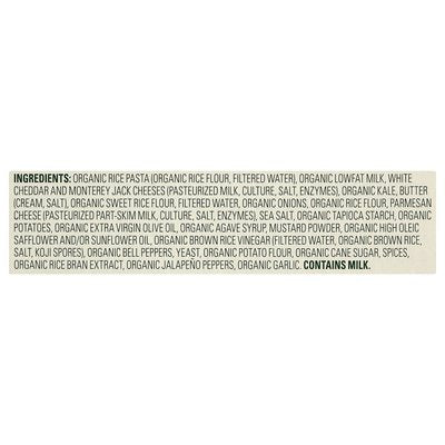 INGREDIENTS: Organic Rice Pasta (Organic Rice Flour, Filtered Water), Organic Lowfat Milk, White Cheddar and Monterey Jack Cheeses (Pasteurized Milk, Culture, Salt, Enzymes), Organic Kale, Butter (Cream, Salt), Organic Sweet Rice Flour, Filtered Water, Organic Onions, Organic Rice Flour, Parmesan Cheese (Pasteurized Part-Skim Milk, Culture, Salt, Enzymes), Sea Salt, Organic Tapioca Starch, Organic Potatoes, Organic Extra Virgin Olive Oil, Organic Agave Syrup, Mustard Powder, Organic High Oleic Safflower and/or Sunflower Oil, Organic Brown Rice Vinegar (Filtered Water, Organic Brown Rice, Salt, Koji Spores), Organic Bell Peppers, Yeast, Organic Potato Flour, Organic Cane Sugar, Spices, Organic Rice Bran Extract, Organic Jalapeno Peppers, Organic Garlic.