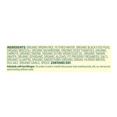 INGREDIENTS:  Organic Brown Rice, Filtered Water, Organic Black-Eyed Peas, Organic Broccoli, Organic Mushrooms, Organic Diced Tomatoes, Organic Carrots, Organic Onions, Organic Extra Virgin Olive Oil, Organic Tamari (Water, Organic Soybeans, Organic Alcohol [To Preserve Freshness], Salt), Organic Cilantro, Organic Ginger Puree (Organic Ginger, Filtered Water), Sea Salt, Organic Garlic, Spices.