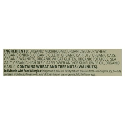 INGREDIENTS:  Organic Mushrooms, Organic Bulgur Wheat, Organic Onions, Organic Celery, Organic Carrots, Organic Oats, Organic Walnuts, Organic Wheat Gluten, Organic Potatoes, Sea Salt, Organic High Oleic Safflower and/or Sunflower Oil, Organic Garlic.