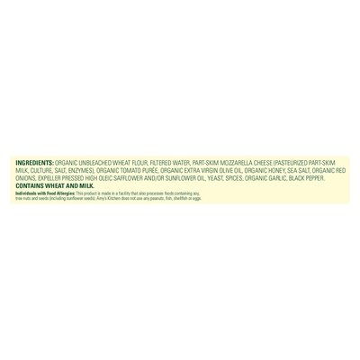 INGREDIENTS:  Organic Unbleached Wheat Flour, Filtered Water, Part-Skim Mozzarella Cheese (Pasteurized Part-Skim Milk, Culture, Salt, Enzymes [Without Animal Enzymes or Rennet]), Organic Tomato Puree, Organic Extra Virgin Olive Oil, Organic Honey, Sea Salt, Organic Red Onions, Expeller Pressed High Oleic Safflower and/or Sunflower Oil, Yeast, Spices, Organic Garlic, Black Pepper.