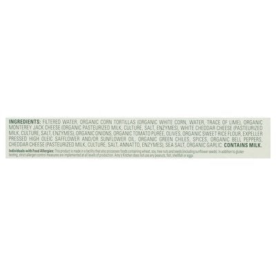 INGREDIENTS:  Filtered Water, Organic Corn Tortillas (Organic White Corn, Water, Trace of Lime), Organic Monterey Jack Cheese (Organic Pasteurized Milk, Culture, Salt, Enzymes), White Cheddar Cheese (Pasteurized Milk, Culture, Salt, Enzymes), Organic Onions, Organic Tomato Purée, Olives, Organic Sweet Rice Flour, Expeller Pressed High Oleic Safflower and/or Sunflower Oil, Organic Green Chiles, Spices, Organic Bell Peppers, Cheddar Cheese (Pasteurized Milk, Culture, Salt, Annatto, Enzymes), Sea Salt, Organic Garlic.