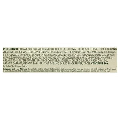 PRODUCT DETAILS: Certified Organic: Quality Assurance International. Certified Organic by QAI. If it's organic. Certified vegan. Vegan.org. Gluten free. Dairy free. It's non-GMO. Microwave or regular oven. We all love lasagna. There is something about the combination of pasta, tomato sauce and melted cheese that spells comfort, and depriving our gluten-intolerant and vegan customers of this comfort food just didn't seem right. So the chefs at Amy's have created a vegetable lasagna made with organic spinach, zucchini, sweet carrots and tofu mixed with organic dairy free mozzarella-style cheeze between layers of tender rice pasta. And of course, don't forget the sauce. Amy's own traditional sauce made with organic vine-ripened tomatoes. Salute e buon appetito! In addition to gluten testing, strict allergen control measures are implemented at all levels of production. Amy's Kitchen does not use any peanuts, fish, shellfish or eggs. From our home to yours. Family owned since 1987. After the birth of our daughter Amy in 1987, we found there was little time to prepare the quality homemade food we normally ate. Realizing there were others like ourselves, we started Amy's Kitchen to prepare delicious meals for those who care about the food they eat but are often too busy to cook. We use only the finest ingredients and prepare them with the same careful attention in our kitchen as you would in your own home. No meat, fish, shellfish, poultry, eggs or peanuts are ever used in any Amy's products. amys.com. how2recycle.info. We love to cook for you. amys.com. Look for us in the soup aisle! Certified 100% recycled paperboard.