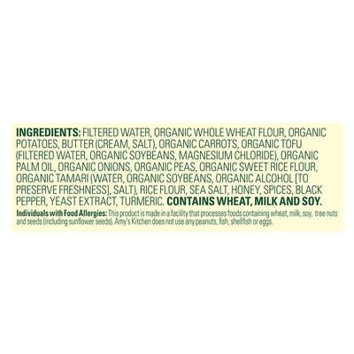 INGREDIENTS: Filtered Water, Organic Whole Wheat Flour, Organic Potatoes, Butter (Cream, Salt), Organic Carrots, Organic Tofu (Filtered Water, Organic Soybeans, Magnesium Chloride), Organic Palm Oil, Organic Onions, Organic Peas, Organic Sweet Rice Flour, Organic Tamari (Water, Organic Soybeans, Organic Alcohol [to Preserve Freshness], Salt) Rice Flour, Sea Salt, Honey, Spices, Black Pepper, Yeast Extract, Turmeric.
