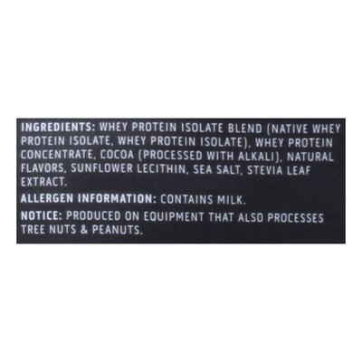 INGREDIENTS: Whey Protein Isolate Blend (Native Whey Protein Isolate, Whey Protein Isolate), Whey Protein Concentrate, Cocoa (Processed with Alkali), Natural Flavors, Sunflower Lecithin, Sea Salt, Stevia Leaf Extract.