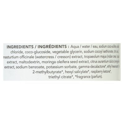 INGREDIENTS: Aqua/Water/Eau, Sodium Coco-Sulfate, Sodium Chloride, Coco-Glucoside, Vegetable Glycerin, Sodium Cocoyl Isethionate, Citric Acid, Nasturtium Officinale (Watercress/Cresson) Extract, Tropaeolum Majus (Indian Cress/Capucine), Extract, Maltodextrin, Moringa Oleifera Seed Extract, Citrus Aurantium Dulcis (Orange) Leaf Extract, Sodium Benzoate, Potassium Sorbate, Gamma-Decalactone (Fragrance (Parfum)), Ethyl Hexanoate (Fragrance (Parfum)), Ethyl 2-Methylbutyrate (Fragrance (Parfum)), Hexyl Salicylate (Fragrance (Parfum)), Raspberry Ketone (Fragrance (Parfum)), Triethyl Citrate (Fragrance (Parfum)).