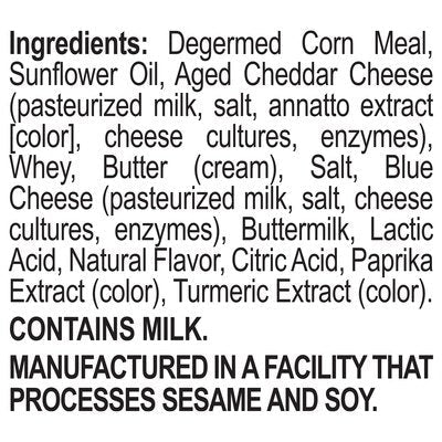 INGREDIENTS: Degermed Corn Meal, Sunflower Oil, Aged Cheddar Cheese (Pasteurized Milk, Salt, Annatto Extract [Color], Cheese Cultures, Enzymes), Whey, Butter (Cream), Salt, Blue Cheese (Pasteurized Milk, Salt, Cheese Cultures, Enzymes), Buttermilk, Lactic Acid, Natural Flavor, Citric Acid, Paprika Extract (Color), Turmeric Extract (Color).
