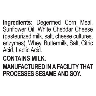 INGREDIENTS: Degermed Corn Meal Sunflower Oil, White Cheddar Cheese (Pasteurized Milk, Salt, Cheese Cultures, Enzymes), Whey, Buttermilk, Salt, Citric Acid, Lactic Acid.