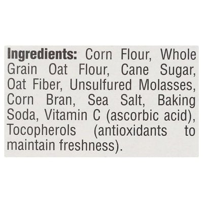 INGREDIENTS: Corn Flour, Whole Grain Oat Flour, Cane Sugar, Oat Fiber, Unsulfured Molasses, Corn Bran, Sea Salt, Baking Soda, Vitamin C (Ascorbic Acid), Tocopherols (Antioxidants to Maintain Freshness).