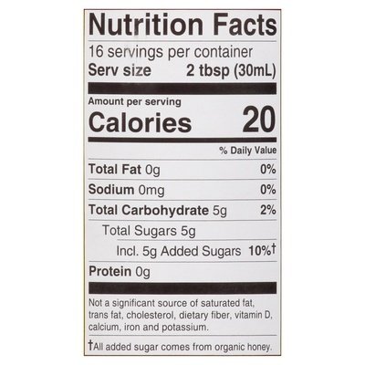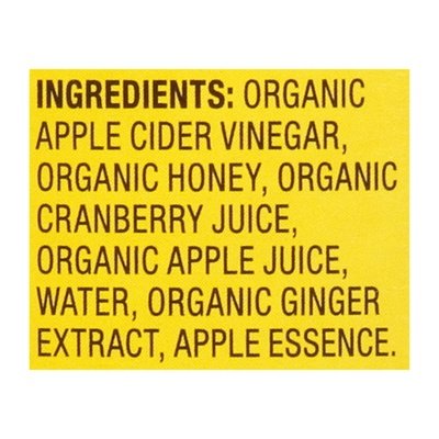 INGREDIENTS: Organic Apple Cider Vinegar, Organic Honey, Organic Cranberry Juice, Organic Apple Juice, Water, Organic Ginger Extract, Apple Essence.