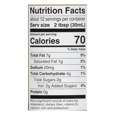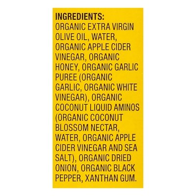 INGREDIENTS: Organic Extra Virgin Olive Oil, Water, Organic Apple Cider Vinegar, Organic Honey, Organic Garlic Puree (Organic Garlic, Organic White Vinegar), Organic Coconut Liquid Aminos (Organic Coconut Blossom Nectar, Water, Organic Apple Cider Vinegar and Sea Salt), Organic Dried Onion, Organic Black Pepper, Xanthan Gum.