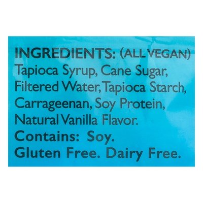 INGREDIENTS: (All Vegan) Tapioca Syrup, Cane Sugar, Filtered Water, Tapioca Starch, Carrageenan, Soy Protein, Natural Vanilla Flavor.