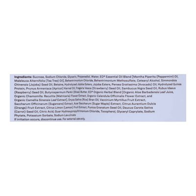 INGREDIENTS: Sucrose, Sodium Chloride, Glycerin, Propanediol, Water, Eo Essential Oil Blend [Mentha Piperita (Peppermint) Oil, Meleleuca Alternifolia (Tea Tree) Oil], Behentrimonium Chloride, Behentrimonium Methosulfate, Cetearyl Alcohol, Simmondsia Chinensis (Jojoba) Seed Oil, Betaine, Hydrolyzed Jojoba Esters, Jojoba Esters, Persea Gratissima (Avocado) Oil, Hydrolyzed Quinoa Protein, Prunus Armeniaca (Apricot) Kernel Oil, Fragaria Vesca (Strawberry) Seed Oil, Sambucus Nigra Seed Oil, Rubus Idaeus (Raspberry) Seed Oil, Butyrospermum Parkil (Shea) Butter, Eo Organic Herbal Blend [Organic Aloe Barbadensis Leaf Juice, Organic Chamomilla Recutita (Matricaria) Flower Extract, Organic Calendula Officinalis Flower Extract, and Organic Camellia Sinensis Leaf Extract), Oryza Sativa (Rice) Bran Oil, Vaccinium Myrtillus Fruit Extract, Saccharum Officinarum (Sugarcane) Extract, Acer Saccharum (Sugar Maple) Extract, Citrus Aurantium Dulcis (Orange) Fruit Extract, Citrus Limon (Lemon) Fruit Extract, Punica Granatum Seed Oil, Daucus Carota Sativa (Carrot) Seed Oil, Citric Acid, Guar Hydroxypropyltrimenium Chloride, Tocopherol, Glyceryl Caprylate, Sodium Phytate, Potassium Sorbate, Sodium Levulinate.
