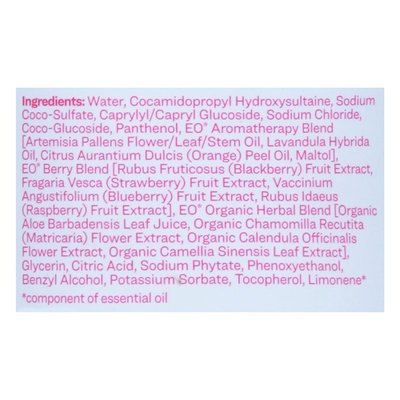 INGREDIENTS: Water, Cocamidopropyl Hydroxysultaine, Sodium Coco-Sulfate, Caprylyl/Capryl Glucoside, Sodium Chloride, Coco-Glucoside, Panthenol, Eo (Component of Essential Oil) Aromatherapy Blend [Artemisia Pallens Flower/Leaf/Stem Oil, Lavandula Hybrida Oil, Citrus Aurantium Dulcis (Orange) Peel Oil, Maltol], Eo (Component of Essential Oil) Berry Blend [Rubus Fruticosus (Blackberry) Fruit Extract, Fragaria Vesca (Strawberry) Fruit Extract, Vaccinium Angustifolium (Blueberry) Fruit Extract, Rubus Ldaeus (Raspberry) Fruit Extract], Eo Organic Herbal Blend [Organic Aloe Barbadensis Leaf Juice, Organic Chamomilla Recutita (Matricaria) Flower Extract, Organic Calendula Officinalis Flower Extract, Organic Camellia Sinensis Leaf Extract], Glycerin, Citric Acid, Sodium Phytate, Phenoxyethanol, Benzyl Alcohol, Potassium Sorbate, Tocopherol, Limonene (Component of Essential Oil).
