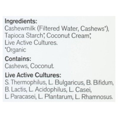 INGREDIENTS: Cashewmilk (Filtered Water, Cashews (Organic)), Tapioca Starch (Organic), Coconut Cream (Organic), Live Active Cultures. Live Active Cultures: S. Thermophilus, L. Bulgaricus, B, Bifidum, B. Lactis, L. Acidophilus, L. Casei, L. Paracasei, L. Plantarum, L. Rhamnosus.