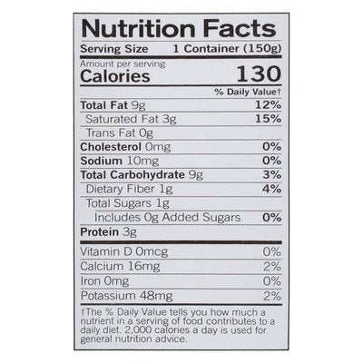 PRODUCT DETAILS: Dairy-free yogurt alternative. 1 g total sugar per serving (This product is not a low calorie food. See nutritional facts for calorie, fat, and total sugar content). USDA Organic. Certified Organic by CCOF. Certified Vegan. vegan.org. Gluten-free. Soy-free. Certified Organic by CCOF. Non-GMO & more. Non-GMO. Stir it up! Respect nature. Be organic. Eat mostly plants. Come forage with us. foragerproject.com. Tear. Separate. Recycle.