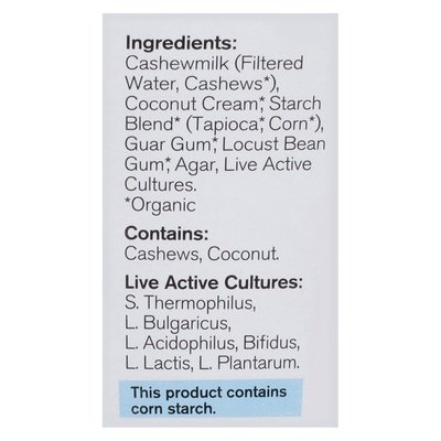 INGREDIENTS: Cashewmilk (Filtered Water, Cashews (Organic)), Coconut Cream (Organic), Starch Blend (Organic) (Tapioca (Organic), Corn (Organic)), Guar Gum (Organic), Locust Bean Gum (Organic), Agar, Live Active Cultures.
