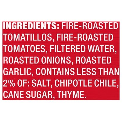 INGREDIENTS: Fire-Roasted Tomatillos, Fire-Roasted Tomatoes, Filtered Water, Roasted Onions, Roasted Garlic, Contains Less than 2% of: Salt, Chipotle Chile, Cane Sugar, Thyme.