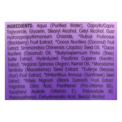 INGREDIENTS: Aqua (Purified Water), Caprylic/Capric Triglyceride, Glycerin, Stearyl Alcohol, Cetyl Alcohol, Guar Hydroxypropyltrimonium Chloride, Rubus Fruticosus (Blackberry) Fruit Extract (USDA Certified Organic), Cocos Nucifera (Coconut) Fruit Extract (USDA Certified Organic), Simmondsia Chinensis (Jojoba) Seed Oil, Cocos Nucifera (Coconut) Oil (USDA Certified Organic), Butyrospermum Parkii (Shea) Butter Extract (USDA Certified Organic), Hydrolyzed Paullinia Cupana (Keratin) Extract, Argania Spinosa (Argon) Kernel Oil (USDA Certified Organic), Macadamia Ternifolia (Macadamia) Seed Extract (USDA Certified Organic), Euterpe Oleracea (Acai) Fruit Extract (USDA Certified Organic), Helianthus Annuus (Sunflower) Seed Extract (USDA Certified Organic), Ribes Nigrum (Black Currant) Fruit Extract (USDA Certified Organic), Fragrance, Citric Kid, Panthenol (Pro-Vitamin B5), Tocopheryl Acetate (Vitamin E), Polysorbate 60, Phenoxyethanol, Dellydiesoslicacid, Benzyl Alcohol.
