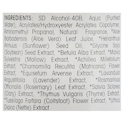 INGREDIENTS: SD Alcohol-40b, Aqua (Purified Water), Acrylates/Hydroxyester Acrylates Copolymer, Aminomethyl Propanol, Natural Acrylates Copolumer, Aminomethyl Propanol, Natural, Fragrance, Aloe Barbadensis (Aloe Vera) Leaf Juice (USDA Certified Organic), Helianthus Annuus (Sunflower) Seed Oil (USDA Certified Organic), Glycine Soja (Soybean) Seed Extract (USDA Certified Organic), Betula Alba Extract (USDA Certified Organic), Malva Sylvestris (Mallow) Extract (USDA Certified Organic), Achillea Millefolium Extract (USDA Certified Organic), Chamomilla Recutita (Matricaria) Flower Extract (USDA Certified Organic), Equisetum Arvense Extract (USDA Certified Organic), Lavandula Angustifolia (Lavender) Extract (USDA Certified Organic), Rosmarinus Officinalis (Rosemary) Leaf Extract (USDA Certified Organic), Salvia Sclarea (Clary) Extract (USDA Certified Organic), Thymus Vulgaris (Thyme) Extract (USDA Certified Organic), Tussilago Farfara (Coltsfood) Flower Extract (USDA Certified Organic), Urtica Dioica (Nettle Extract).