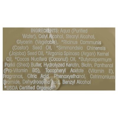 INGREDIENTS: Aqua (Purified Water), Cetyl Alcohol, Stearyl Alcohol, Glycerin (Vegetable), Ricinus Communis (Castor) Seed Oil (USDA Certified Organic,), Simmondsia Chinensis (Jojoba) Seed Oil (USDA Certified Organic,), Argania Spinosa (Argan) Kernel Oil (USDA Certified Organic,), Cocos Nucifera (Coconut) Oil (USDA Certified Organic,), Butyrospermum Parkii (Shea) Butter (USDA Certified Organic,), Hydrolyzed Keratin, Biotin, Panthenol (Pro-Vitamin B5), Tocopheryl Acetate (Vitamin E), Fragrance, Citric Acid, Phenoxyethanol, Cetrimonium Bromide, Dehydroacetic Acid, Benzyl Alcohol.