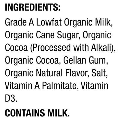 INGREDIENTS: Grade A Lowfat Organic Milk, Organic Cane Sugar, Organic Cocoa (Processed with Alkali), Organic Cocoa, Gellan Gum, Organic Natural Flavor, Salt, Vitamin A Palmitate, Vitamin D3.