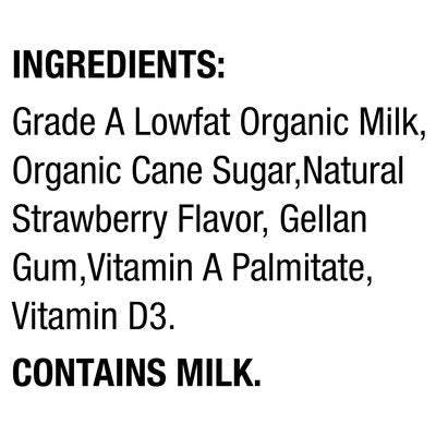 INGREDIENTS: Grade A Lowfat Organic Milk, Organic Cane Sugar, Natural Strawberry Flavor, Gellan Gum, Vitamin A Palmitate, Vitamin D3.