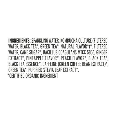 INGREDIENTS: Sparkling Water, Kombucha Culture (Filtered Water, Black Tea (Certified Organic Ingredient), Green Tea (Certified Organic Ingredient), Natural Flavor (Certified Organic Ingredient)) (Certified Organic Ingredient), Filtered Water, Cane Sugar (Certified Organic Ingredient), Bacillus Coagulans MTCC 5856, Ginger Extract (Certified Organic Ingredient), Pineapple Flavor (Certified Organic Ingredient), Peach Flavor (Certified Organic Ingredient), Black Tea (Certified Organic Ingredient), Black Tea Essence (Certified Organic Ingredient), Caffeine (Green Coffee Bean Extract) (Certified Organic Ingredient), Green Tea (Certified Organic Ingredient), Purified Stevia Leaf Extract (Certified Organic Ingredient).