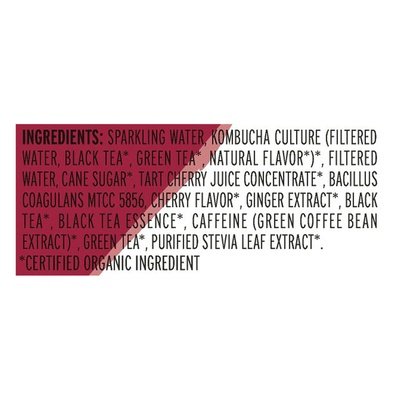 INGREDIENTS: Sparkling Water, Kombucha Culture (Filtered Water, Black Tea (Certified Organic Ingredient), Green Tea (Certified Organic Ingredient), Natural Flavor (Certified Organic Ingredient)) (Certified Organic Ingredient), Filtered Water, Cane Sugar (Certified Organic Ingredient), Tart Cherry Juice Concentrate (Certified Organic Ingredient), Bacillus Coagulans MTCC 5856, Cherry Flavor (Certified Organic Ingredient), Ginger Extract (Certified Organic Ingredient), Black Tea (Certified Organic Ingredient), Black Tea Essence (Certified Organic Ingredient), Caffeine (Green Coffee Bean Extract) (Certified Organic Ingredient), Green Tea (Certified Organic Ingredient), Purified Stevia Leaf Extract (Certified Organic Ingredient).