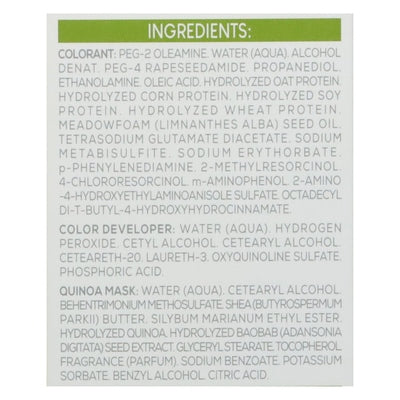 DESCRIPTION: This Kit Contains: 1. Naturtint Colorant 2.03 fl.oz. / 60 ml e. 2. Color Developer 2.03 fl.oz. / 60 ml e. 3. Quinoa Mask 1.69 fl.oz. / 50 ml e. 4. Protective Gloves. 5. Instruction Leaflet. Suitable for vegans. Gluten free. Colors inspired by nature. Ammonia free. Long-lasting gray coverage. Quinoa mask. New! Radiant color & shine. Silky & hydrated hair. Clean beauty, science in harmony. Intense long-lasting permanent hair color innovative and gentle formula inspired by nature. Olive Oleic Acid: Provides vitality and moisturization, for smoother, nourished hair. Meadowfoam Seed Oil: Nourishes and conditions the hair for extended shine and color. Quinoa Mask: Quinoa (Grown and harvested using sustainable practices): A complete protein with all essential amino acids that helps to fix the hair color, resulting in longer-lasting and more intense shades. Organic Shea Butter (Grown and harvested using sustainable practices): Deeply moisturizing and nourishing, thanks to its high concentration of vitamins and fatty acids. Baobab Proteins (Grown and harvested using sustainable practices): Nourishes the hair from root to tips, providing vitality, shine and volume. Healthier, younger looking hair. Final color result will depend on the color. Thickness and overall condition of your hair so a color strand test, prior to full application, is recommended. You can go as dark as you wish with Naturint when lightening your hair, you can only lighten up to 2 shade numbers. Dermatologically tested. Expert color & care. Laboratorios Phergal - Inspiring beauty. QS International quality system. Swiss Certified Privat Label. ISO 22716. GMP Certified by QS International. www.naturtintusa.com. www.phergal.com. For additional tips on color selection and application techniques, please contact the Naturtint USA helpline at 518-434-0340. www.naturtintusa.com. Email: info(at)naturtintusa.com. USDA Certified Biobased Product: Product 79%. Naturally responsible. FSC: Mix - Packaging from responsible sources. www.fsc.org. Forests for all forever. Against animal testing. Made in Spain. < Colorant: PEG-2 Oleamine, Water (Aqua), Alcohol Denat. PEG-4 Rapeseedamide, Propanediol, Ethanolamine, Oleic Acid, Hydrolyzed Oat Protein, Hydrolyzed Corn Protein, Hydrolyzed Soy Protein, Hydrolyzed Wheat Protein, Meadowfoam (Limnanthes Alba) Seed Oil, Tetrasodium Glutamate Diacetate, Sodium Metabisulfite, Sodium Erythorbate, p-Phenylenediamine, 2-Methylresorcinol, 4-Chlororesorcinol, m-Aminophenol, 2-Amino -4-Hydroxyethylaminoanisole Sulfate, Octadecyl Di-T-Butyl-4-Hydroxyhydrocinnamate. Color Developer: Water (Aqua), Hydrogen Peroxide, Cetyl Alcohol, Cetearyl Alcohol, Ceteareth-20, Laureth-3, Oxyquinoline Sulfate, Phosphoric Acid. Quinoa Mask: Water (Aqua), Cetearyl Alcohol, Behentrimonium Methosulfate Shea (Butyrospermum Parkii) Butter, Silybum Marianum Ethyl Ester, Hydrolyzed Quinoa, Hydrolyzed Baobab (Adansonia Digitata) Seed Extract, Glyceryl Stearate, Tocopherol, Fragrance (Parfum), Sodium Benzoate, Potassium Sorbate, Benzyl Alcohol, Citric Acid.