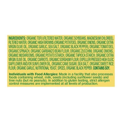 INGREDIENTS: Organic Tofu (Filtered Water, Organic Soybeans, Magnesium Chloride), Filtered Water, Organic Hash Browns (Organic Potatoes, Organic Onions, Organic Extra Virgin Olive Oil, Organic Garlic, Sea Salt, Organic Black Pepper), Organic Tomatoes, Organic Spinach, Organic Garbanzo Bean Flour, Organic Zucchini, Organic Onions, Organic Mushrooms, Organic Potato Starch, Organic Tapioca Starch, Organic Extra Virgin Olive Oil, Organic Carrots, Organic Sorghum Flour, Expeller Pressed High Oleic Safflower and/or Sunflower Oil, Organic Cane Sugar, Sea Salt, Organic Sweet Rice Flour, Organic Garlic, Nutritional Yeast, Spices, Organic Black Pepper.