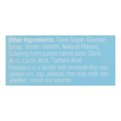 INGREDIENTS: Other Ingredients: Cane Sugar, Glucose Syrup, Water, Gelatin, Natural Flavors, Coloring from Anthocyanins, Citric Acid, Lactic Acid, Tartaric Acid.