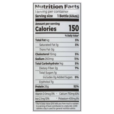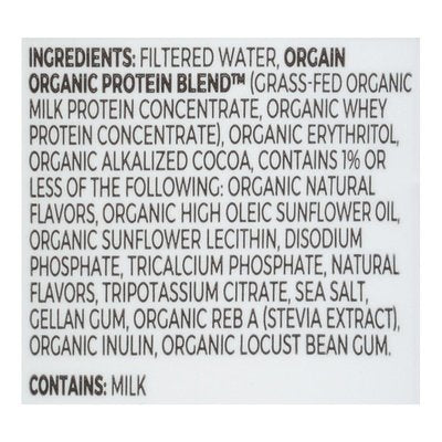 INGREDIENTS: Filtered Water, Orgain Organic Protein Blend (Grass-Fed Organic Milk Protein Concentrate, Organic Whey Protein Concentrate), Organic Erythritol, Organic Alkalized Cocoa, Contains 1% or Less of the Following: Organic Natural Flavors, Organic High Oleic Sunflower Oil, Organic Sunflower Lecithin, Disodium Phosphate, Tricalcium Phosphate, Natural Flavors, Tripotassium Citrate, Sea Salt, Gellan Gum, Organic Reb A (Stevia Extract), Organic Inulin, Organic Locust Bean Gum.
