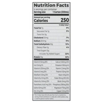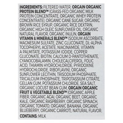 INGREDIENTS: Filtered Water, Orgain Organic Protein Blend (Grass-Fed Organic Milk Protein Concentrate, Organic Whey Protein Concentrate), Organic Cane Sugar, Organic Brown Rice Syrup, Organic Rice Dextrin, Organic High Oleic Sunflower Oil, Organic Natural Flavor, Organic Inulin, Orgain Vitamin & Minerals Blend (Sodium Ascorbate, Magnesium Sulfate Zinc Gluconate, DL-Alpha Tocopheryl Acetate, Niacinamide, Vitamin A Palmitate, Potassium Iodide, Copper Gluconate, Biotin, Calcium D-Pantothenate, Cyanocobalamin, Cholecalciferol, Folic Acid, Thiamin Hydrochloride, Pyridoxine Hydrochloride, Riboflavin), Organic Sunflower Lecithin, Trisodium Phosphate, Tricalcium Phosphate, Tripotassium Citrate, Gellan Gum, Potassium Chloride, Sea Salt, Organic Locust Bean Gum, Orgain Organic Fruit & Vegetable Blend (Organic Apple Fiber, Organic Acai, Organic Beet, Organic Kale, Organic Raspberry, Organic Spinach, Organic Tomato, Organic Banana Organic Blueberry, Organic Carrot), Natural Flavor.