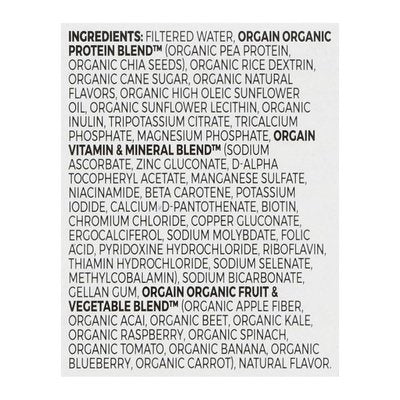 INGREDIENTS: Filtered Water, Orgain Organic Protein Blend, (Organic Pea Protein, Organic Chia Seeds), Organic Rice Dextrin, Organic Cane Sugar, Organic Natural Flavors, Organic High Oleic Sunflower Oil, Organic Sunflower Lecithin, Organic Inulin, Tripotassium Citrate, Tricalcium Phosphate, Magnesium Phosphate, Orgain Vitamin & Mineral Blend (Sodium Ascorbate, Zinc Gluconate, D-Alpha Tocopheryl Acetate, Manganese Sulfate, Niacinamide, Beta Carotene, Potassium Iodide, Calcium D-Pantothenate, Biotin, Chromium Chloride Copper Gluconate, Ergocalciferol, Sodium Molybdate, Folic Acid, Pyridoxine Hydrochloride, Riboflavin, Thiamin Hydrochloride, Sodium Selenate, Methylcobalamin), Sodium Bicarbonate, Gellan Gum, Orgain Organic Fruit & Vegetable Blend, (Organic Apple Fiber, Organic Acai, Organic Beet, Organic Kale, Organic Raspberry, Organic Spinach, Organic Tomato, Organic Banana Organic Blueberry, Organic Carrot), Natural Flavor.