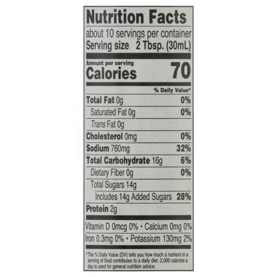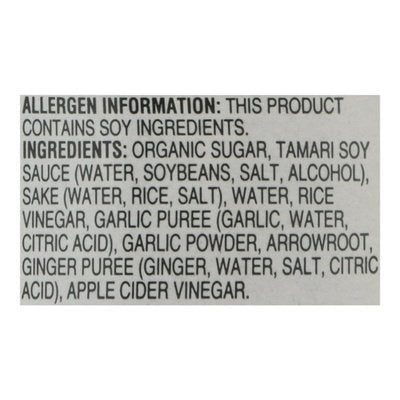 INGREDIENTS: Organic Sugar, Tamari Soy Sauce (Water, Soybeans, Salt, Alcohol), Sake (Water, Rice, Salt), Water, Rice Vinegar, Garlic Puree (Garlic, Water, Citric Acid), Garlic Powder, Arrowroot, Ginger Puree (Ginger, Water, Salt, Citric Acid), Apple Cider Vinegar.