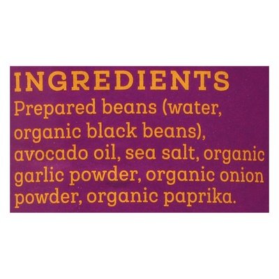 INGREDIENTS: Prepared Beans (Water, Organic Black Beans), Avocado Oil, Sea Salt, Organic Garlic Powder, Organic Onion Powder, Organic Paprika.